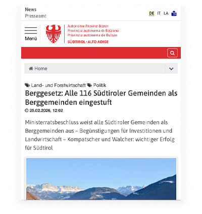 Ministerratsbeschluss weist alle Südtiroler Gemeinden als Berggemeinden aus – Begünstigungen für Investitionen und Landwirtschaft – Kompatscher und Walcher: wichtiger Erfolg für Südtirol