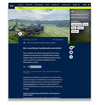 Wenn Landwirte ihre Wiesen mähen, geht das mit einem modernen Kreiselmähwerk am allerschnellsten. Nachteil: Insekten haben dabei schlechte Überlebenschancen. Besser wäre es, auf eine vermeintlich alte Mähtechnik mit Messerbalken zu setzen.